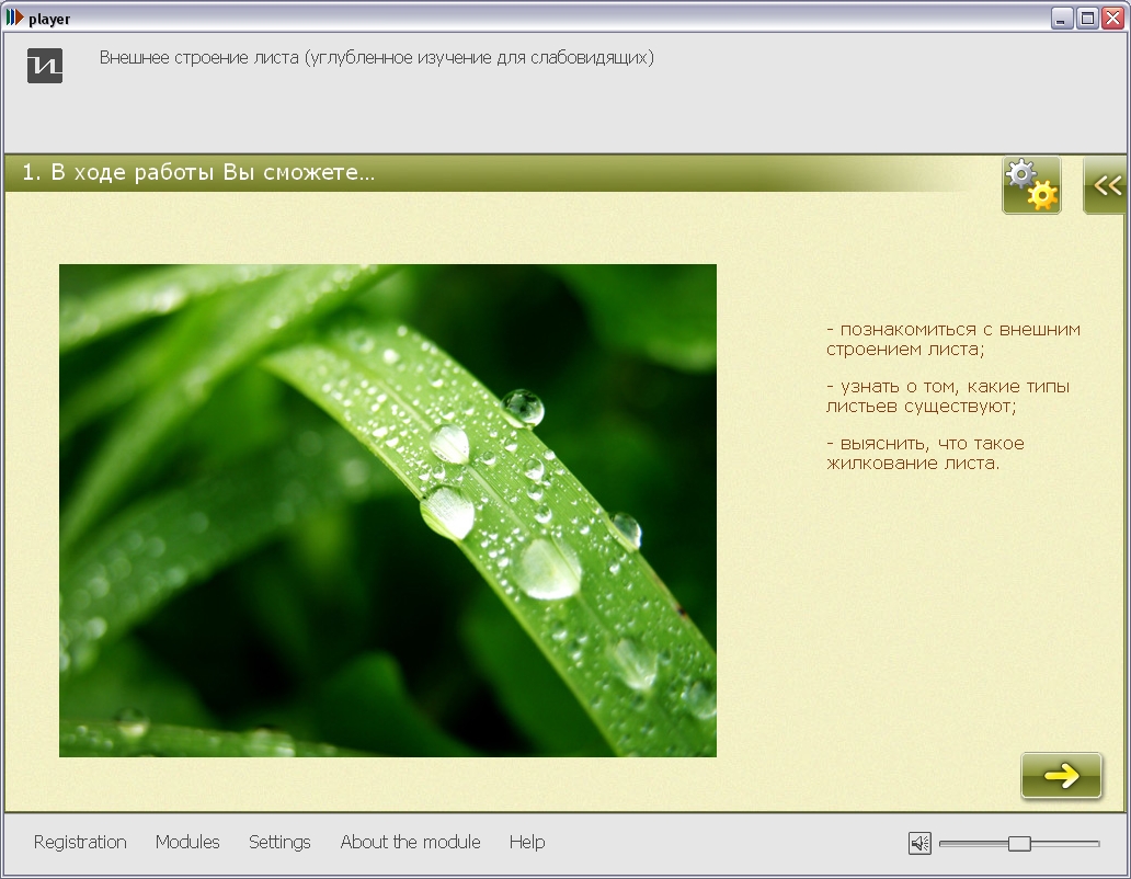 Модуль предназначен для изучения материала по теме «Внешнее строение листа» для углубленного изучения предмета. Содержит специальные настройки, облегчающие работу учащимся с пониженной остротой зрения и нарушенным восприятием цветов