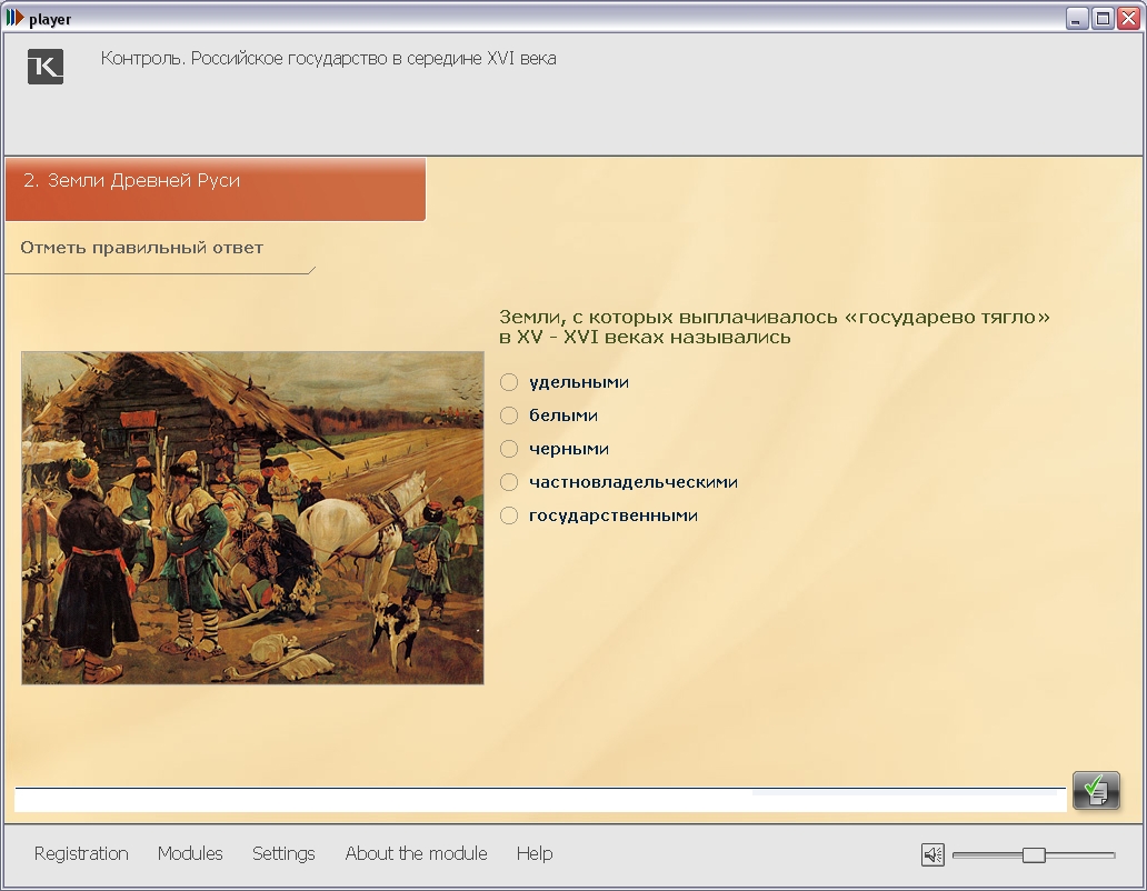 1. Контрольный модуль предназначен для выяснения учащимся степени усвоения изученного в лекциях и практикумах материалов. 2. Модуль составлен с учетом психолого-возрастных особенностей учащегося, Образовательного стандарта и выполненных ранее учащимся лекций и практик. Что позволяет лучше закрепить в памяти весь пройденный курс, без вступления в конфликт различных его частей. 3. Задания модуля выполнены в виде тестов, с одним и более выборов вариантов ответа. 4. Кроме тестовых заданий, существуют задания на нахождение соответствий, аналогичные тем, которые выполнялись ранее в практикумах. Такой тип заданий кроме логического мышления и тренировки кратковременной и долговременной памяти, воздействует на зрительную память и восприятие, что необходимо для полноценного развития учащегося. Примером задания такого характера служит задание из раздела «Становление Российского государства», где учащемуся предлагается не только найти соответствие, но и расставить события в хронологической последовательности. Это поможет учащемуся лучше понимать причинно-следственные связи развития и становления государства, а также событиям, приведшие к Опричнине. 5. В конце каждого модуля есть раздел "Результаты выполнения работы", который показывает, сколько времени было потрачено на выполнение каждого раздела, сколько ошибок было допущено. И показан общий результат как времени, затраченного на работу с модулем, так и процента правильного выполнения задания. Это поможет учащемуся скорректировать свою работу и самостоятельно изучить те разделы, по которым процент правильных ответов крайне низок, а также работу учителя и провести дополнительные беседы и дать задания, помогающие учащемуся лучше усвоить программу.