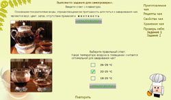 Модуль предназначен для изучения чая, определения его качества. Представлены рецепты приготовления различного чая, свойства и условия хранения. Материал сопровождается яркими иллюстрациями и видео материалом. Модуль содержит дополнительные мультимедиа материалы, развивающие тему относительно базового уровня, что позволяет высокомотивированным ученикам глубже усвоить тему и творчески применять знания в практической деятельности. Для закрепления полученных знаний содержит задания для самопроверки. Разобраться с работой модуля поможет электронный помощник – маленький повар.