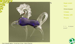 Модуль знакомит с такими центрами русского художественного стекла как Гусевской хрустальный завод, Дятьковский хрусталь, Макграв и другими. Содержит специальные настройки, облегчающие работу учащимся с пониженной остротой зрения и нарушенным восприятием цветов. В правом нижнем углу экрана расположен значок для перехода в сцену с настройками, где можно подобрать размер шрифта, цвет фона и выбрать диктора. Значок для увеличения текстовых и графических материалов и озвучивания текстов находится рядом с объектом или появляется при расположении на нём курсора.