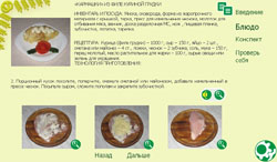 В модуле представлен рецепт приготовления «кармашков» из филе куриной грудки. Подробное описание рецепта сопровождается яркими иллюстрациями и аудиоматериалом. Содержит специальные настройки, облегчающие работу учащимся с пониженной остротой зрения и нарушенным восприятием цветов. В правом нижнем углу экрана расположен значок для перехода в сцену с настройками, где можно подобрать размер шрифта и цвет фона. Значок для увеличения текстовых и графических материалов и озвучивания текстов находится рядом с объектом или появляется при расположении на нём курсора.