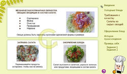 Модуль предназначен для изучения холодных блюд и закусок - их разнообразия и оформления. Рассмотрены требования к качеству блюд и технология их приготовления, история происхождения популярных салатов и их рецепты. Материал сопровождается яркими иллюстрациями и аудиоматериалом. Для закрепления знаний содержит задания для самопроверки. Разобраться с работой модуля поможет анимированный помощник – маленький повар.