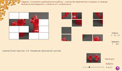 Модуль предназначен для закрепления знаний произведений народных промыслов русского художественного стекла. Раздел «Пазлы» модуля помогает вспомнить отличительные черты и особенности каждого центра декоративно-прикладного искусства.
