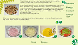 В модуле представлен рецепт приготовления рулета из слоеного теста с болгарским перцем и ветчиной. Подробное описание рецепта сопровождается яркими иллюстрациями и аудиоматериалом. Содержит специальные настройки, облегчающие работу учащимся с пониженной остротой зрения и нарушенным восприятием цветов. В правом нижнем углу экрана расположен значок для перехода в сцену с настройками, где можно подобрать размер шрифта и цвет фона. Значок для увеличения текстовых и графических материалов и озвучивания текстов находится рядом с объектом или появляется при расположении на нём курсора.