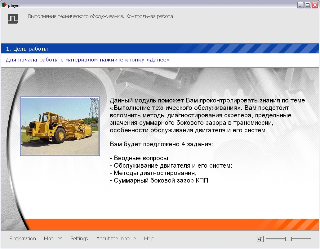 Модуль позволяет проконтролировать знания по теме "Выполнение технического обслуживания". Задания, представленные в модуле, позволяют проконтролировать знание методов диагностирования скрепера, предельных значений суммарного бокового зазора в трансмиссии, особенностей обслуживания двигателя и его систем.